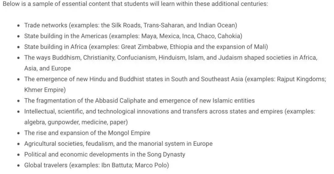 2019年起,AP世界史的考试内容将做出调整:为了让考生在有限的时间内有更好的学习和考试体验,从2019-2020年学年考试,AP世界史现代的部分会从1200CE开始考起,而不是之前的1450CE。 这一时期会重点考察学生们对非洲文明,美洲文明以及亚洲文明的现代时期的掌握。