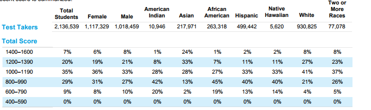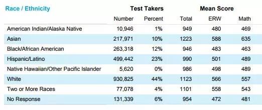 这次,亚裔考生的人数占总考生的10%,平均分是1223分,其中阅读是588分,而数学是635分,可见亚裔学生的数学普遍都是很好的!相比起其他种族,非洲裔的平均分是946,白人的平均分是1123,拉丁裔的平均分是990。