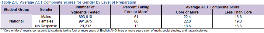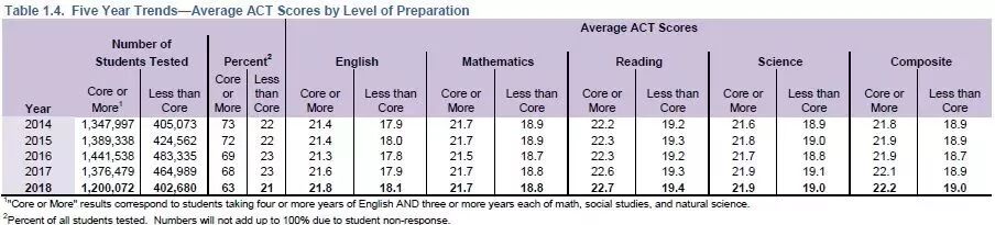由上图我们可以得出,无论是哪一门科目,进行过高中核心课程的ACT考生成绩明显高于没有参加核心课程的学生成绩,而且差异很明显。