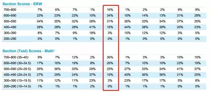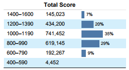 如果你分数在1400-1600,其实你已经是前7%了。1200-1390分数段的学生占到了总人数的20%,而1000-1190的同学占到了2018届考生的35%。