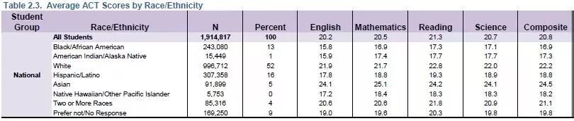 还可以明显看到,亚裔考生的平均成绩分值最高,为24.5分。其次是白人,为22.2分。