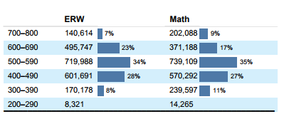 其中我们可以看到,阅读在700-800分数之见的同学占到总人数的前7%,而数学700-800之间的学生占到总人数的9%。