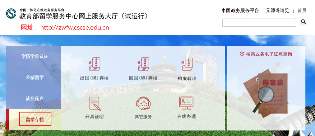登陆教育部留学服务中心网上服务大厅首页,点击“留学存档”