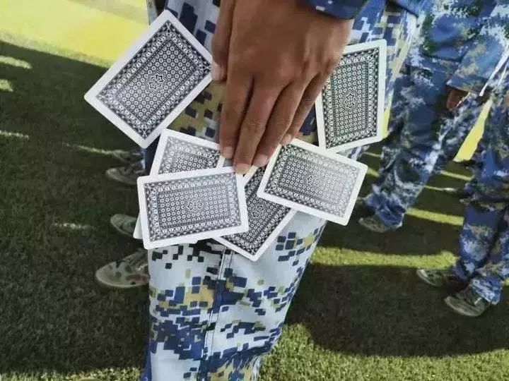 站姿欠佳的学生需要在指缝间,大腿中间等位置放一张扑克牌,如果牌掉了,还需要再加练5分钟。面对这样的魔鬼式训练,有新生持乐观的心态“休息的时候,坐下来,就可以打扑克了。”教官们也纷纷表示一张扑克牌训练出来的站姿效果很好。