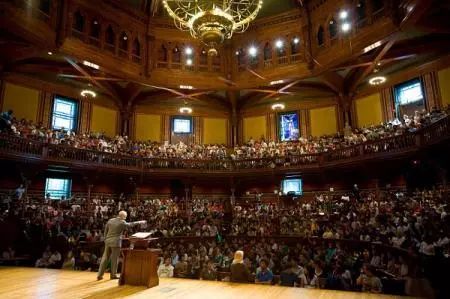 哈佛大学在开学迎新会上,学校会组织新生聚集在露天会场,整点时,校内的教堂钟楼会为新生鸣钟,哈佛老生则会排成队列,让新生在他们的夹道欢迎中进入会场,然后听取校长、院长、老生代表和教授代表的分别致辞。