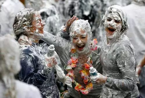 “泡沫大战”即学生们使用剃须泡沫互相攻击,往对方身上涂抹,使那里成为白色的海洋。