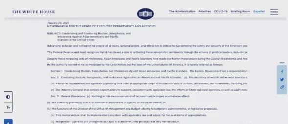 拜登的行政命令还将指导卫生部(HHS)等联邦机构审查川普政府发布的任何现有政策、指示或政府网站中是否有“中国病毒”等仇外言论。