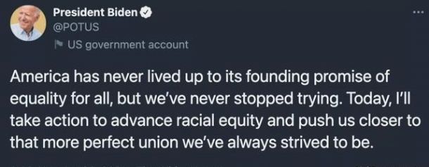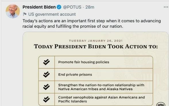 拜登在推特上写道:“美国从来没有实现过建国时作出的人人平等的承诺,但我们从未停止过努力。今天,我将采取行动,推进种族平等,拉近我们彼此之间的距离,建立我们一直在努力实现的目标——一个更加完美的联邦。”