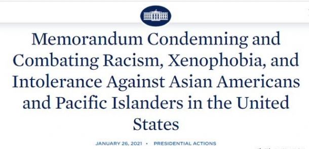 当天,拜登在白宫公开签署了涉及住房、监狱改革、原住民等内容的多项行政命令,其中包括谴责与打击针对亚裔美国人与太平洋岛国民众的种族歧视与仇外心态备忘录。