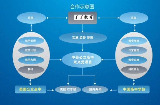 中美公立高中双文凭项目采用美国公立高中与国内学校直接校际合作,实行双学历文凭,采用 2+1 教学模式,其中两年中方教学,全方位引进美方先进的教学理念和高质量的教学体系,由美方提供教学计划、教学大纲、教材、教学管理模式等,授课师资根据双方共同协商,按照开课数量由美方派遣教师,学生完成国内两年课程,第三年,学生可以选择直接合作的美国公立高中,也可以选择其他公立高中,入读 12 年级,并获取美国高中毕业证。中方学校在项目合作中,负责为学生提供良好的教学环境,学生的日常管理及教学的实施;丁丁教育作为中美公立高中双文凭项目的组织及服务方,负责学校前期的接洽与合作方式的确定,协助中方学校与美国公立高中沟通,配合中方学校教学的实施、监督和管理,提供后期学生出国事宜及后续升学服务。